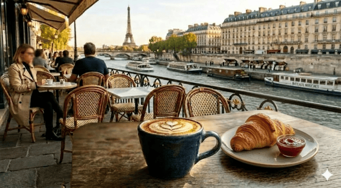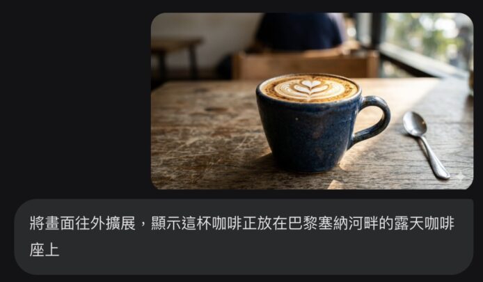 - 指令: 「將畫面往外擴展,顯示這杯咖啡正放在巴黎塞納河畔的露天咖啡座上。」
