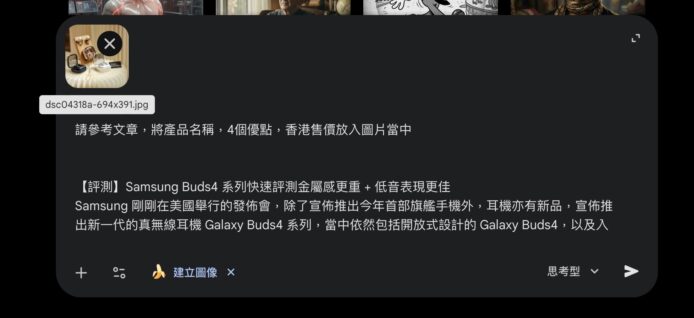首先我們嘗試輸入一篇耳機的評測文章,之後叫 Nano Banana 2 將文章裡面提及過產品優點,連同產品名稱、售價一併加入圖片當中:
