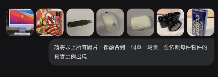 ▲可看到我們將不同物件的圖片上載,能結合成一張全新的集合圖片。雖然相機比例好像小了一點,但你可通過後續向 AI 落指令,將特定物件放大縮小