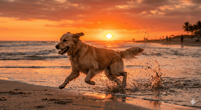 - 指令: 「一隻金毛獵犬在海灘上奔跑,水花濺起的瞬間,水滴在陽光下閃爍,背景是橘紅色的夕陽。」