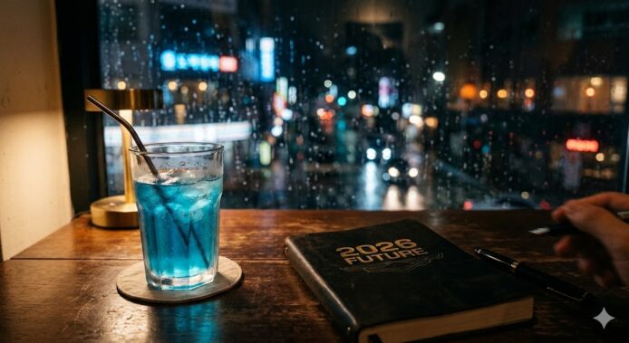 - 指令: 「一張寫實攝影,桌子左側是一個透明玻璃杯盛滿藍色液體,右側是一本封面上寫著『2026 FUTURE』的黑皮書,背景是模糊的雨夜窗戶。」
