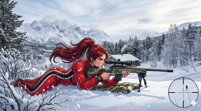 - 指令: 「讓圖片 A 的角色出現在圖片 B 的場景中,並改變她的動作為拿著狙擊槍瞄著他人」