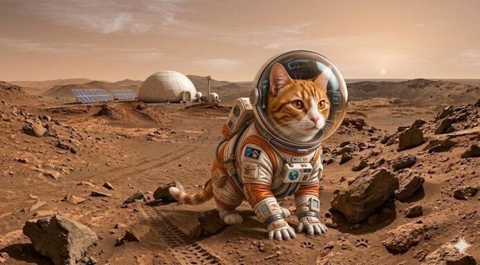 我選取了貓貓相片作為主體,並配上一張荒涼的火星地表圖,要求模型將貓轉移到火星場景中,並為其穿上特製的太空衣。