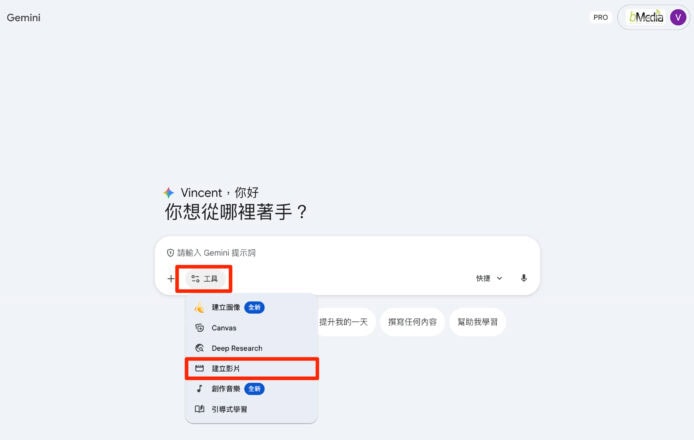 ▲ 開啟 Gemini 「工具」選單並選擇「建立影片」