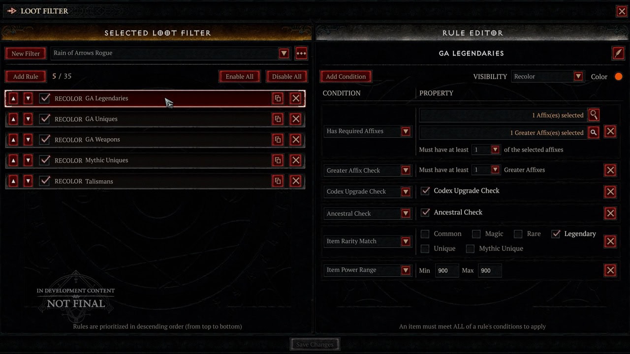 玩家期待已久的戰利品篩選器終於上線。Colin Finer 表示篩選器支援精準邏輯條件設定。不想自己研究的玩家可匯入其他玩家的設定檔。篩選器設有快捷鍵隨時開關,想回頭看隱藏物品完全無難度。