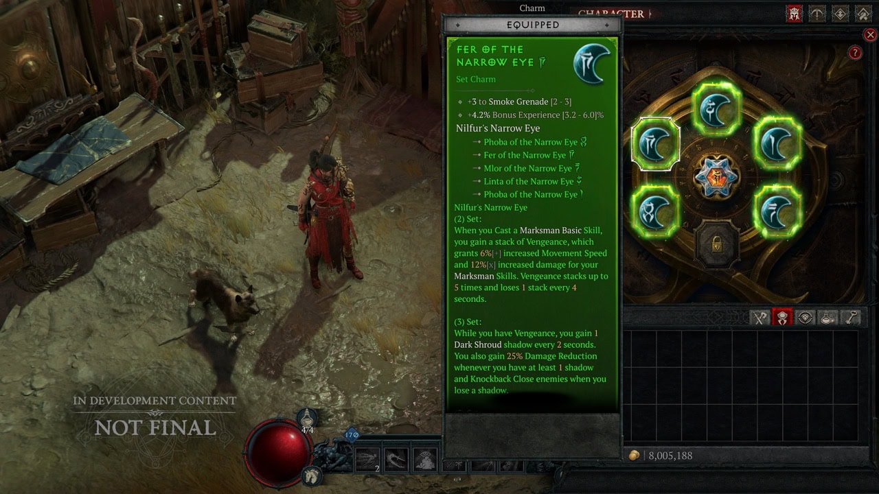 另一個重大改動是咒盤系統。咒盤讓套裝概念以全新形式回到《暗黑破壞神 IV》。玩家取得咒盤後遊戲會掉落咒符。咒符必須裝在咒盤徽印中才會生效。Aislyn Hall 解釋當中的設計巧思。部分徽印讓玩家最多裝五個咒符,湊齊就能獲得五件式套裝加成。亦有徽印只能裝三個但全數可放獨特咒符。獨特咒符擁有特殊力量玩家可發掘截然不同的搭配甚至開啟全新流派。