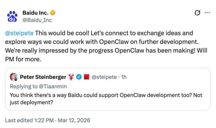百度其後在另一貼文回覆 OpenClaw 開發者 Peter Steinberger。Peter Steinberger 詢問百度能否在部署以外,直接支援 OpenClaw 開發工作。百度官方帳號隨即指「This would be cool」,並邀請 Peter Steinberger 私下訊息詳談,稱對 OpenClaw 近期進展印象深刻,期望交流想法並探索合作方式。