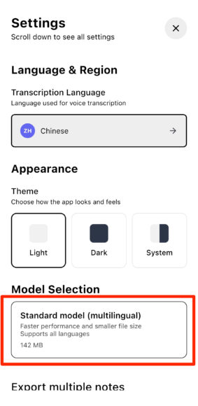 ▲ 有基礎功能的 「standard model」和較強的「Optimized model」。「Optimized model」需要額外下載約 465MB 數據,建議在 Wi-Fi 環境下操作。雖然模型體積較大,但換來的是極高辨識精準度與更強中英夾雜處理能力。