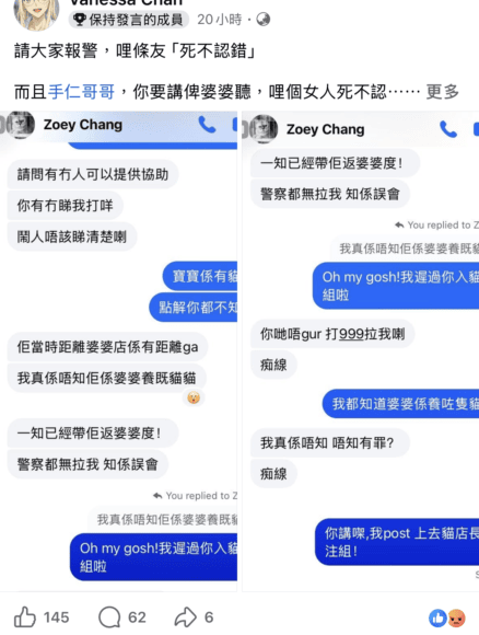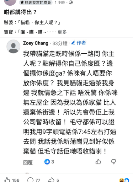 ▲有網民質問 Zoey Chang, 其行為時態度引起網民不滿,因為以入群時間來說,不可能不認識該店貓
