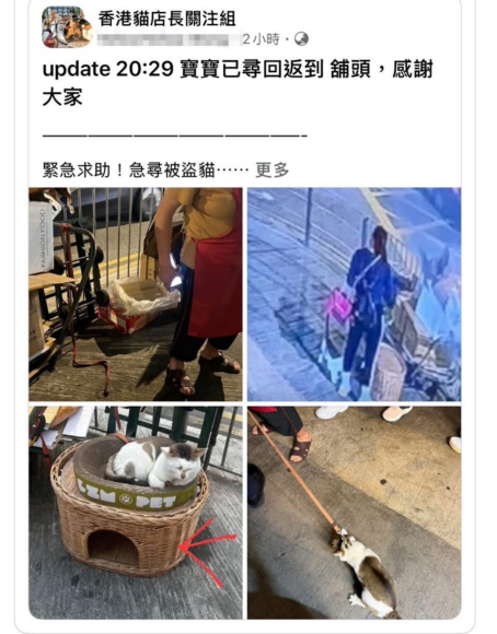 繼上星期旺角藥房店貓被抱走後,昨日晚上約7時40分,新蒲崗六合街一間生果店的人氣貓店長「寶寶」在店外休息期間,被一名身穿瑜伽服、戴口罩及鴨舌帽的女子連同貓窩一併抱走。雖然事隔約一小時後,「寶寶」已由涉事女子送回並平安歸家,但事件成為網民討論焦點,原因是涉嫌拿走店貓的人在社交平台疑似「洗白」,但令網民揭出更多疑點。