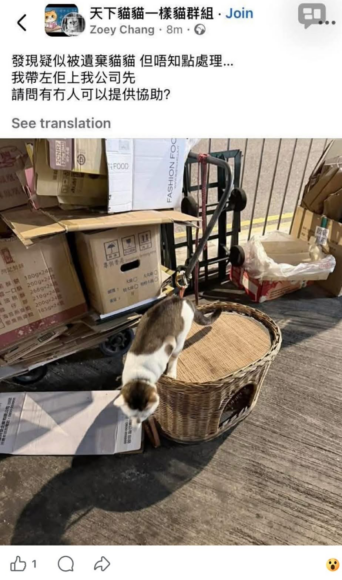 ▲ 網名為 Zoey Chang 的女子在「天下貓貓一樣貓群組」發帖,聲稱自己發現一隻「疑似被遺棄貓貓」